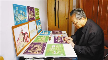 崔福起制作牙签画的灵感源于孙子的手工帆船画。老人制作的第一幅作品是“国庆号”蒸汽机车。崔福起向记者展示了工具材料:胶合板、彩色复印纸、牙签、剪刀、镊子、白乳胶。材料虽简单,但要制成精美的工艺品,还靠一双巧手。“上了年纪眼神不好,有时镊子也拿不稳,一口气做上2个多小时不能动,感觉特别累,但其乐无穷。”